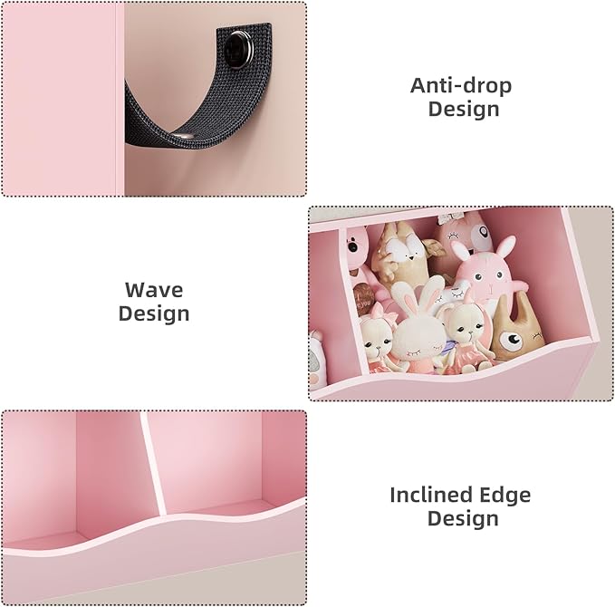 - 【Multi-Functional Storage】The toy storage cabinet equipped with 2 open shelves for favorite books and notebooks, 2 tilted bins for blocks and toy cars, and 3 removable drawers of varying sizes for art supplies or small toys, this organizer keeps children’s rooms tidy and clutter-free. Say goodbye to scattered toys and hello to organized fun.