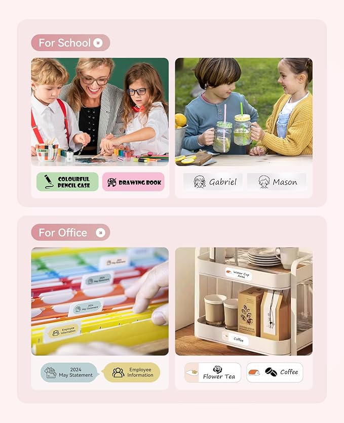 - 【Label Options and Organization】With Intelligent Identification technology, this mini label maker can automatically recognize the label you put in, support a variety size and kind of label paper, such as clear, colorful, cute gift tapes and round labels. The label refills is waterproof and Oil-proof, which can be widely used in Home Kitchen and School. (This label maker is monochrome printout, which only prints black text. We can create color labels buy using color pattern label tapes.)