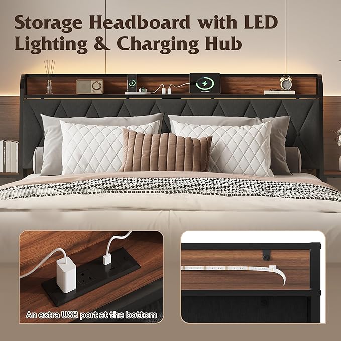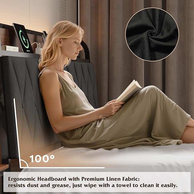 - 【Headboard Storage Shelf with Multi-Port Charging】 The headboard features a single storage shelf perfect for glasses, phones, and remotes. It comes equipped with 2 USB ports, 1 Type-C ports and 2 AC outlets allowing convenient fast charging of multiple devices.