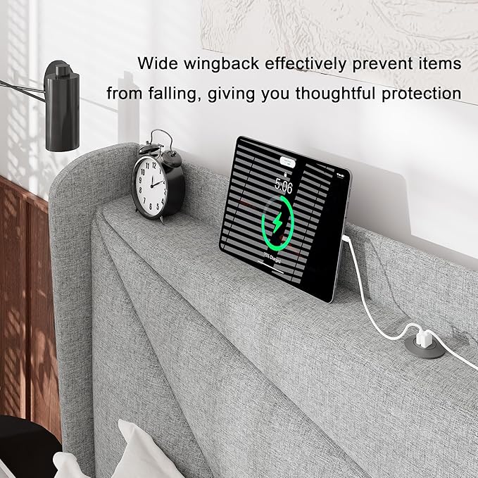 - Special Feature : Heavy-Duty Metal Frame, PD Type-C Fast Charging Station, Soft Linen Fabric, Squeak Resistant, Storage Wingback Headboard Heavy-Duty Metal Frame, PD Type-C Fast Charging Station, Soft Linen Fabric, Squeak Resistant, Storage Wingback Headboard