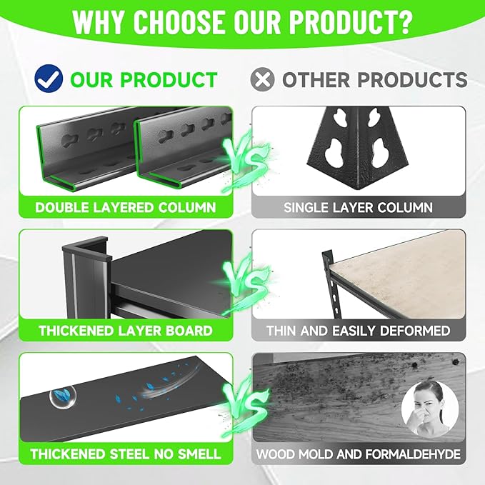- 【Quality Assurance and Professional Support】 Our professional team provides 24/7 online service. Every step from production to delivery undergoes rigorous inspections and passes three distinct quality checks. The reinforced packaging with corner protectors safeguards your metal garage storage shelving unit during transit. Enjoy a one-year warranty with free returns within 30 days; if you encounter any issues, contact us immediately after delivery. We highly value your user experience and are committed to providing optimal service for your garage storage and organization solutions