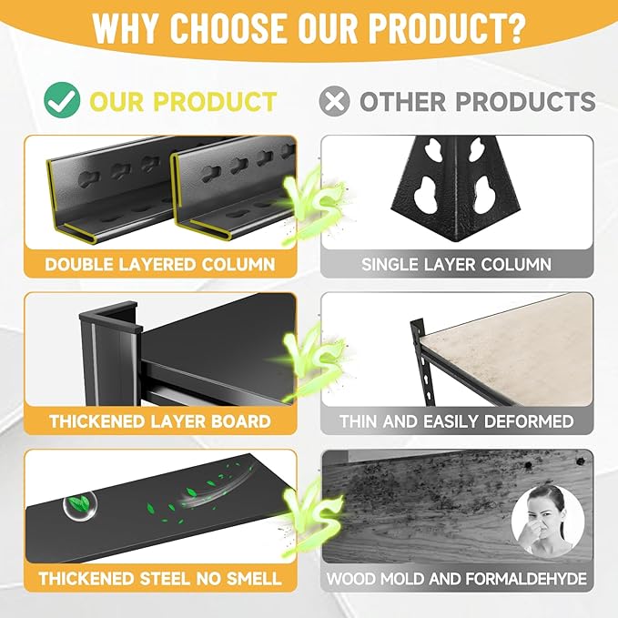 - 【Quality Assurance and Professional Support】 Our professional team provides 24/7 online service. Every step from production to delivery undergoes rigorous inspections and passes three distinct quality checks. The reinforced packaging with corner protectors safeguards your metal garage storage shelving unit during transit. Enjoy a one-year warranty with free returns within 30 days; if you encounter any issues, contact us immediately after delivery. We highly value your user experience and are committed to providing optimal service for your garage storage and organization solutions