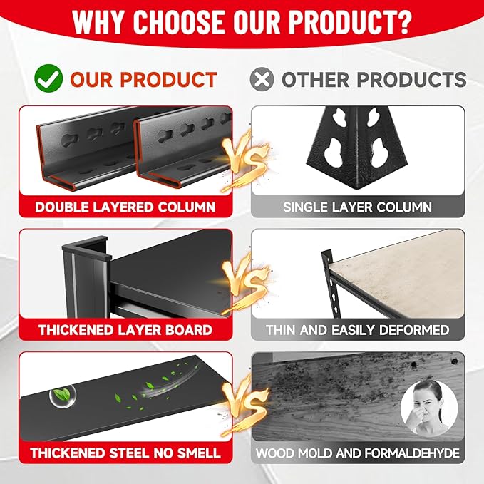 - 【Tips】For your safety and the service life of this garage adjustable steel large storage shelves, please pay attention to its max weight capacity ( per tier: 800 lb) and make sure that your items won't overload it. 2 people and a rubber mallet are recommended during assembly( one person is also ok with it)