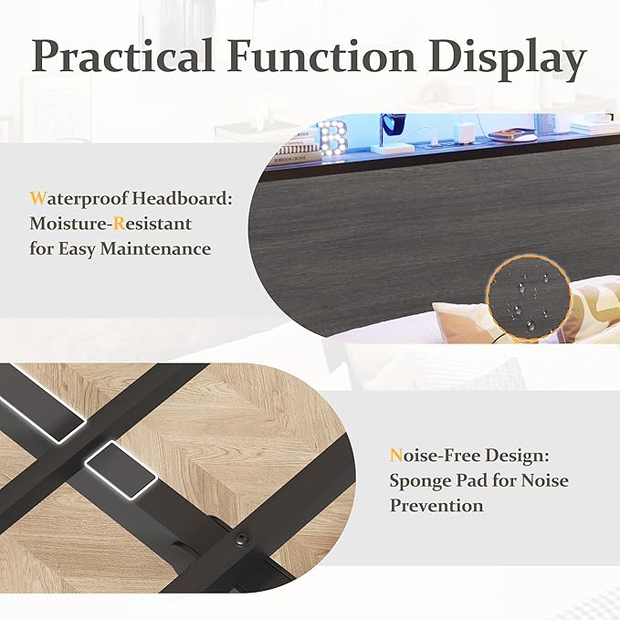 - 【Storage Headboard with Charging Station】The headboard is equipped with a built-in charging station, including 2 AC Outlets, a USB port and a type-C port, allowing you to charge various electronic devices within easy reach. 2-Tier Storage shelf on the headboard can provide more storage space, making it convenient for you to place commonly used items such as magazines, phones, alarm clocks, etc
