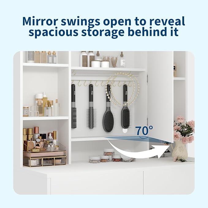 - 【Illuminated vanity mirror】 This vanity with mirror and lights features an LED mirror offering 3 adjustable lighting modes (Cold White, Warm White, Warm Yellow). Easily customize the brightness via the touch screen to perfect your makeup every time on this makeup vanity desk with lights.