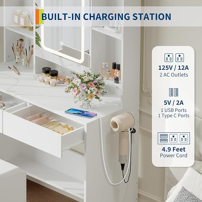 - 【Dressing Table Set】 This vanity with chair set includes a cushioned stool and features a built-in US outlet with USB port and a Type-C port for powering hair tools or charging devices. An integrated hair dryer rack keeps your styling tools handy, providing a complete solution for your womens vanity.