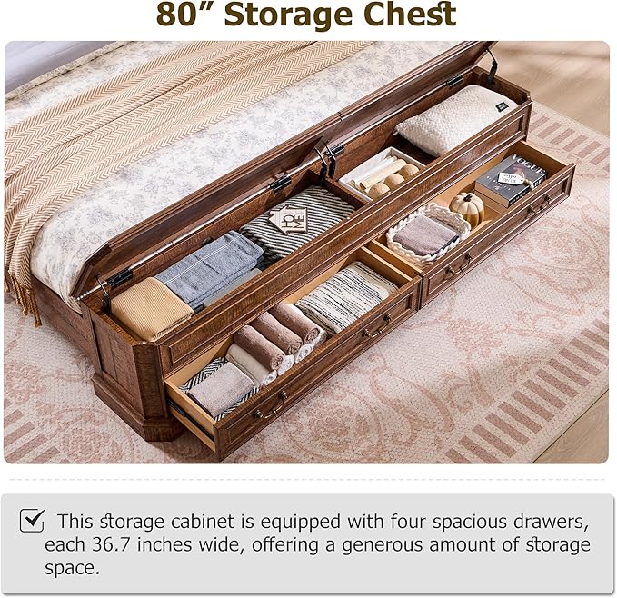 - Four Large Storage Drawer: The 64-inch storage chest is a standout feature of this bed frame. This chest is not only a stylish addition to the bed but also a practical solution for keeping your bedroom organized and clutter-free. The drawers are spacious and easy to access, each drawer measures 28.7 inches wide and 5.7 inches deep, offering plenty of room for all your storage needs: blankets, clothes, books, and more.