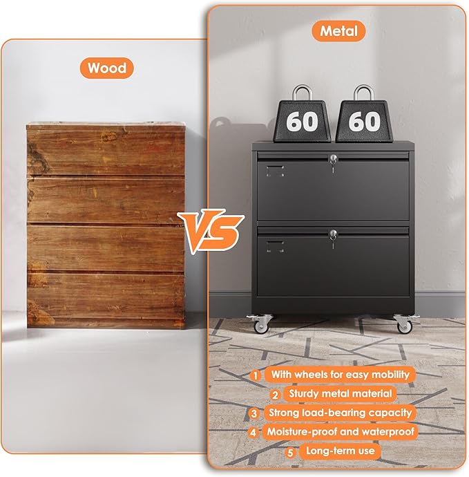 - 【High Quality Construction】The file cabinet with wheels is made of heavy duty steel material, and the surface with powder coating is very smooth, which can avoid rust. Due to their metal surface, metal storage cabinets are easy to clean and maintain.The wheels can be locked, placed fixedly or moved freely