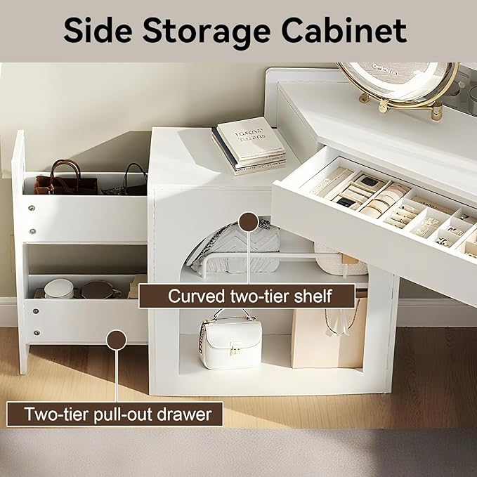 - Space-Saving Corner Design: Perfectly designed to fit snugly into the corner of your bedroom or bathroom, this vanity makes the most of small spaces. Its compact footprint saves valuable room area without compromising functionality.