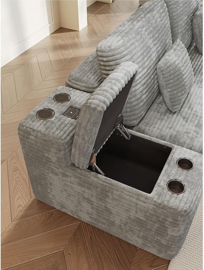 - [Comfortable and Durable Upholstery] Upholstered in light grey plush corduroy fabric, this sectional provides a soft, luxurious touch while maintaining durability for everyday use. The low arms and deep seats create a laid-back, cozy feel that’s perfect for long hours of relaxation or hosting family and friends.