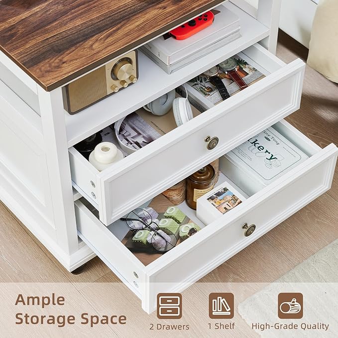 - [Large Storage Space]This night stand has a spacious 24" tabletop, an open compartment, and large-capacity double drawers, combining functions of storage and display. You can organize high-frequency items or decorations in an orderly manner and enhance the style of your bedroom. The drawers of the farmhouse end table are equipped with smooth and silent metal rails and retro round knob handles for your daily use.