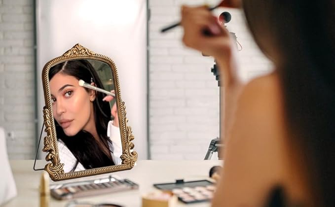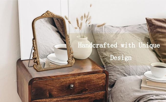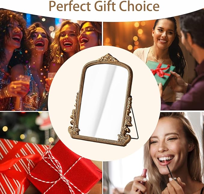- Retro & Ornate Design: Measuring 11.8* 9.6 inch standing mirror features a hand-finished antique gold frame with intricate carvings. Each piece is uniquely crafted, offering a vintage centerpiece for tabletops, dressers, or vanity spaces.
