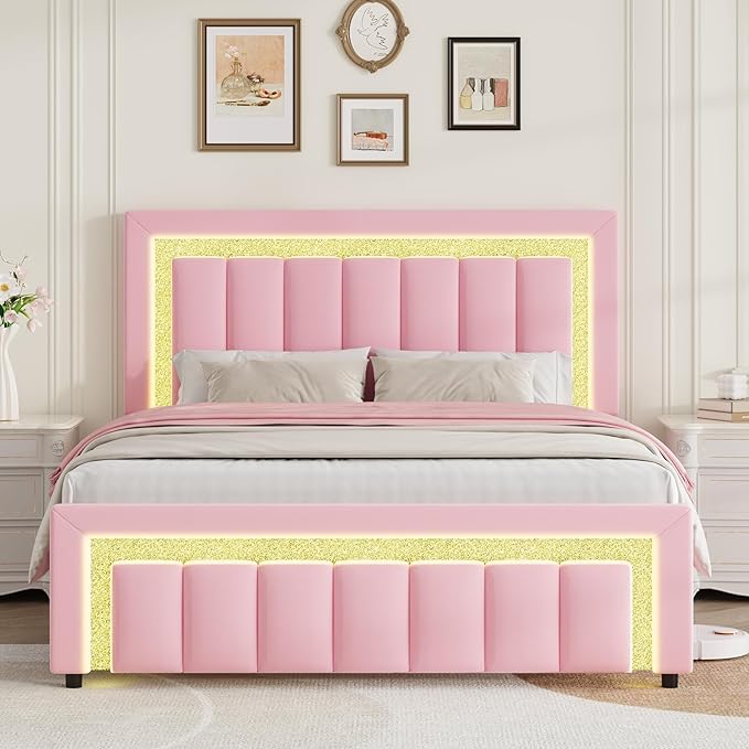 HOMBCK Queen Bed Frame with LED Lights and Velvet Upholstered Headboard, Bed Frame Queen Size with Modern Diamond Headboard Adjustable, Wooden Slats Support, Noise Free, No Box Spring Needed, Pink
