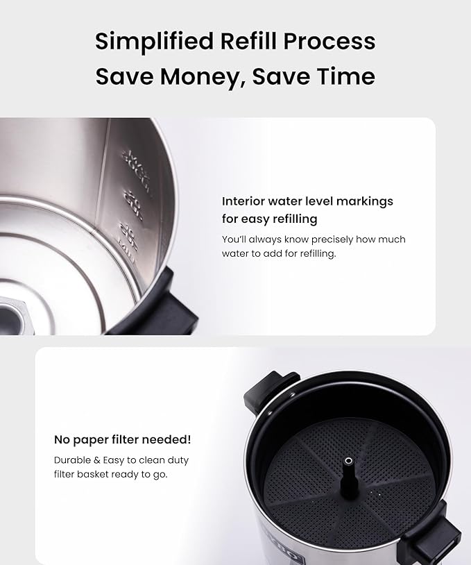 - User-Friendly: Clear coffee level markings inside the urn make filling and refilling simple and convenient. No need to guess when it's time for another batch