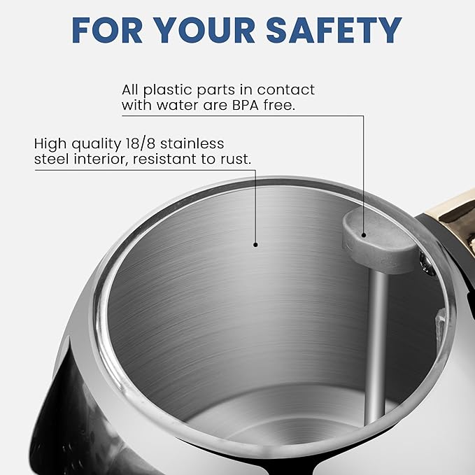 - ECO-FRIENDLY MATERIALS | BUILT TO LAST: The interior of the SUSTEAS electric kettle is made of 18/8 stainless steel (including spout and lid), which greatly improves durability and safety. All plastic components that come into direct contact with water are devoid of BPA, ensuring your safety and reassurance. The exterior surface is treated with electroplating paint, which is wear-resistant and scratch-resistant, making it easy to maintain