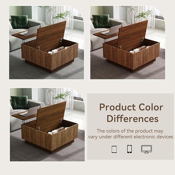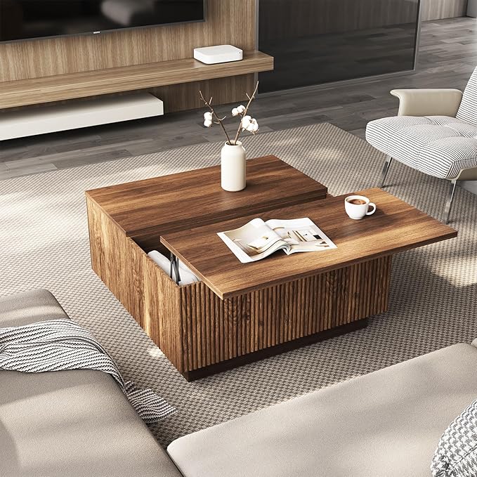 31" Lift Top Coffee Table with Hidden Storage, Farmhouse Square Wood Center Table with Fluted Design for Living Room, Apartment, Small Spaces, Brown Walnut