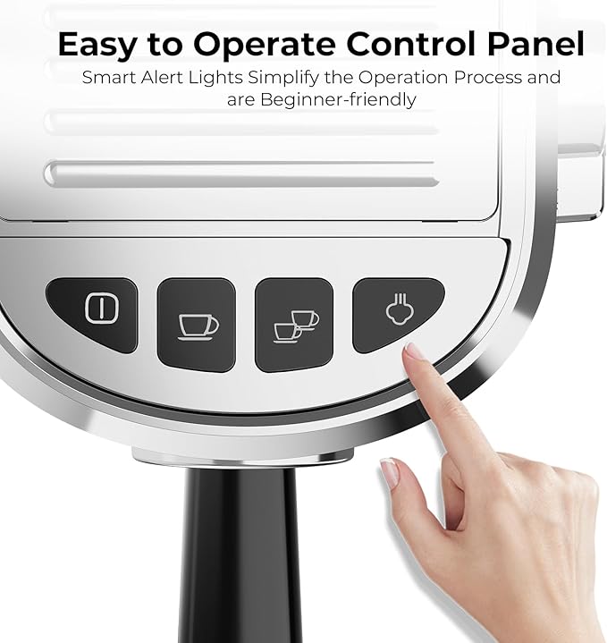 - [Easy to Use & Clean]:The coffee machine is equipped with simple control panel and indicator lights.Adopts a PID precision temperature control system which can accurately control water temperature and steam temperature. It is a espresso coffee machine suitable for beginners. Built to last with stainless steel housing, it features a removable 34oz water tank and drip tray for quick cleanup. The descaling function helps maintain peak performance