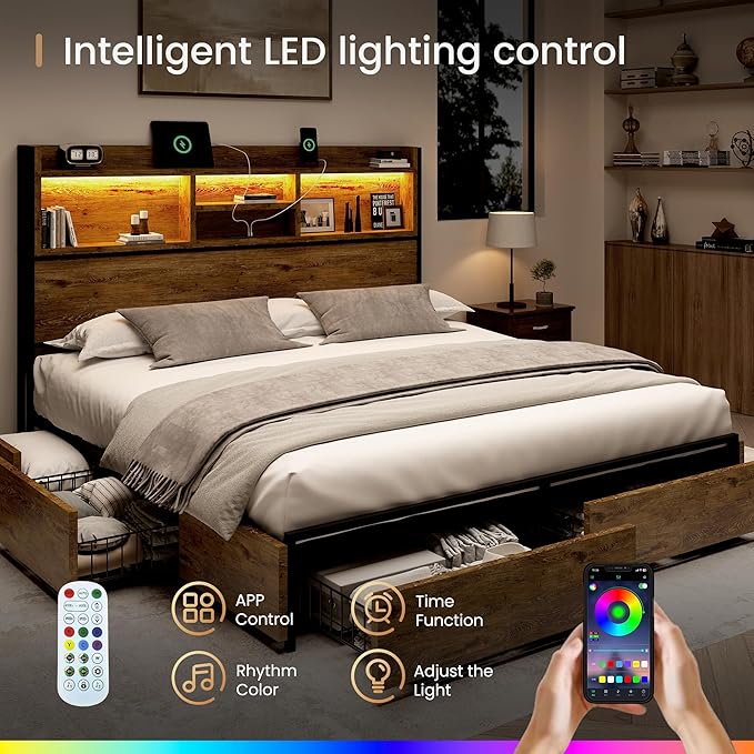 • 【Immersive RGB Lighting】King Smart LED Bed Frame with 24 lighting effects. Sync colors to music via App (iOS/Android). Shatterproof strips for durable ambiance.