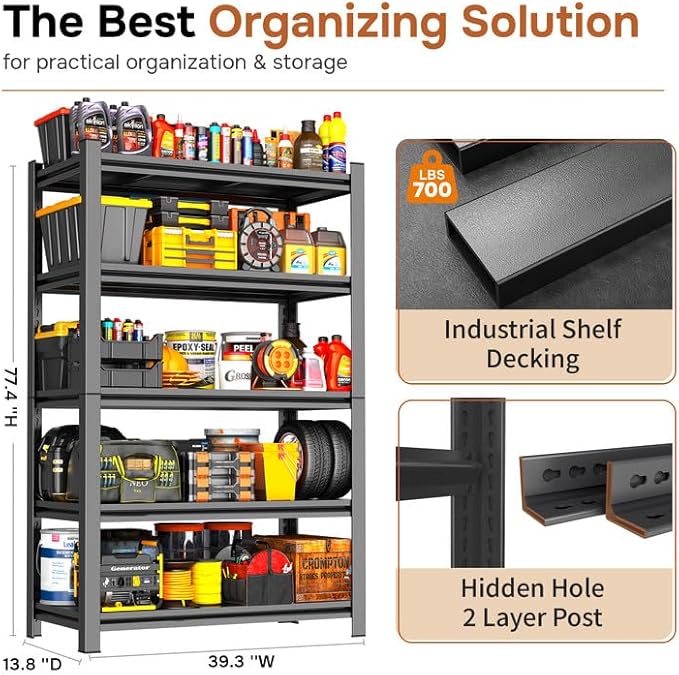 - πͺ COMMERCIAL-GRADE STRENGTH, 3500 LBS BEAST MODE β Don't settle for flimsy shelves. Our garage shelving is forged from high-quality, thickened cold-rolled steel and features an exclusive double-layered column design for unmatched stability. It effortlessly supports a massive 3500 LBS total capacity (700 LBS per shelf). From heavy power tools and packed totes to engine parts, store your heaviest items with absolute peace of mind. Conquer your clutter with confidence!