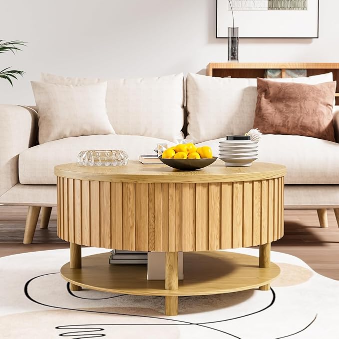 Round Lift Top Coffee Table with Storage, 31.5'' Modern 2-Tier Coffee Table with Hidden Storage Compartment and Open Shelf, Fluted Center Table for Living Room Office (Wood Color)