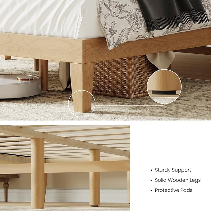 - [Modern Design] Crafted with a natural solid wood frame, this bed frame features a sleek and simple style that adds a touch of elegance to your bedroom. The headboard-free design saves space, making it a perfect choice for small or modern rooms.