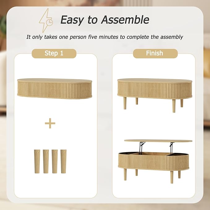 - Five-Minute Assembly: The main body of the coffee table arrives fully assembled—you only need to install the four sturdy legs, making setup quick and effortless. In just five minutes, your table is ready to use, saving you both time and hassle.