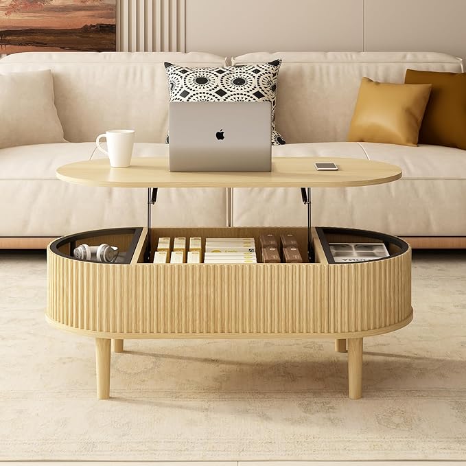 Ludatido 39 Inch Lift Top Coffee Table with 3 Storage for Living Room, Oval Coffee Table with Hidden Compartment, Fully Wooden Center Easy to Assembled for Home Living Room Office Burlywood