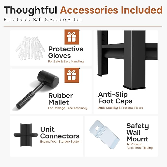 - β 10-MINUTE ASSEMBLY, ZERO FRUSTRATION β No tools, no bolts, no headaches. Thanks to our brilliant interlocking system, you can assemble this entire storage rack by hand in 10 minutes or less. We designed it for real life, so you'll spend more time organizing your space and less time reading confusing instructions. Get your garage, workshop, or basement organized the moment it arrives.