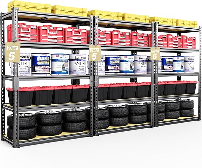 - 【Heavy Duty Garage Shelving 2050 lbs Capacity】: Engineered for serious storage! TigerParty garage shelving features rolled-edge, thickened steel columns with support ribs. Combined with the robust metal frame and wood boards, each storage shelf holds 404 lbs. The entire shelving unit boasts a massive 2050 lbs total capacity, making this 5-tier garage storage shelves system incredibly stable and solid for maximum load.