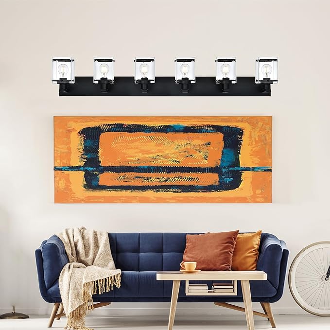 6-Light Bathroom Light Fixture Black Finish, Modern Vanity Lighting with Rectangular Clear Glass for Over Mirror Kitchen E26 Bulb Base