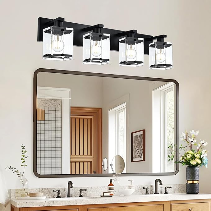 4-Light Bathroom Vanity Light Fixture, Modern Black Wall Lighting Over Mirror with Rectangular Clear Glass, E26 Bulb Base