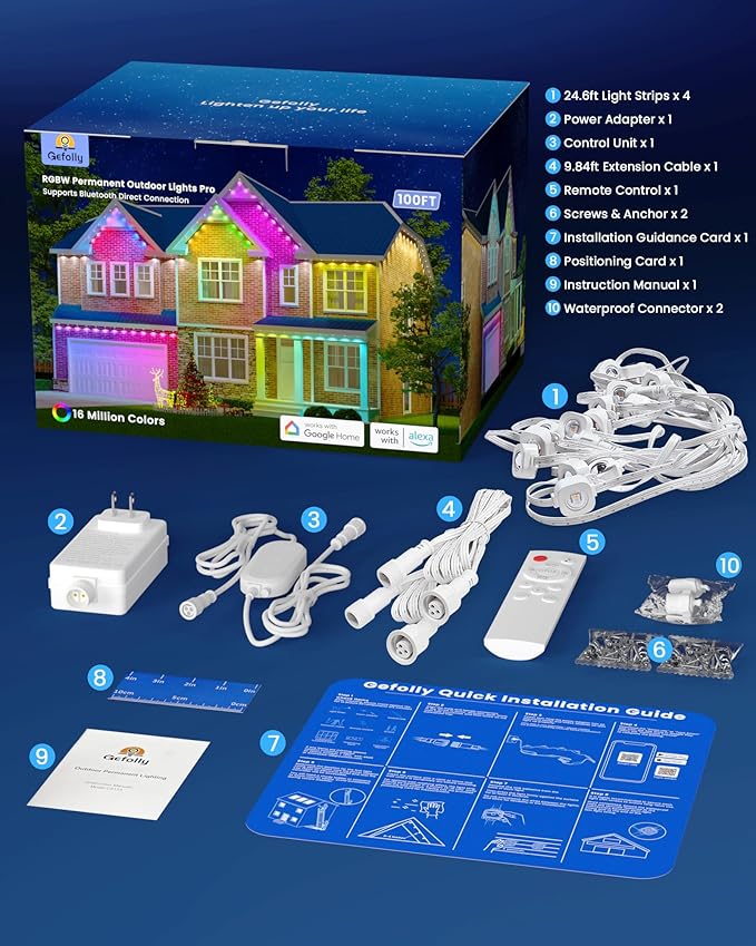 • Smart App and Voice Control: Use the "Smart Life" or "Tuya Smart“ app to individually control the color of each Gefolly outdoor light and set timers to light up your holiday party. Or create your own custom patterns, colors, and brightness levels. These lights are compatible with Alexa and Google Assistant for convenient, hands-free voice control.