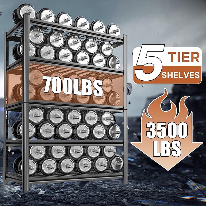 - 💪 COMMERCIAL-GRADE STRENGTH, 3500 LBS BEAST MODE – Don't settle for flimsy shelves. Our garage shelving is forged from high-quality, thickened cold-rolled steel and features an exclusive double-layered column design for unmatched stability. It effortlessly supports a massive 3500 LBS total capacity (700 LBS per shelf). From heavy power tools and packed totes to engine parts, store your heaviest items with absolute peace of mind. Conquer your clutter with confidence!