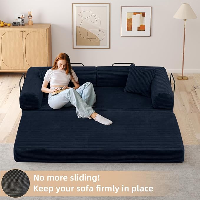 Rovibek 4-in-1 Convertible Sleeper Sofa Bed Queen Size, Foldable Floor Couch Corduroy, Folding Futon Sofa Beds with Pillow and Fixed-Shape Frame, Suitable for Living Room, Bedroom, Lounge, Dark Blue