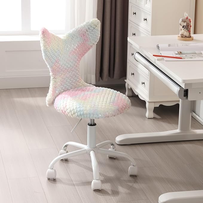 Fuzzy Desk Chair, Cute Swivel Children Desk Chair with Wheels for Kids Bedroom Upholstered Rolling Study Chair Adjustable Computer Chair Mermaid Back Vanity Chair for Teen Girls Boys, Light Colorful