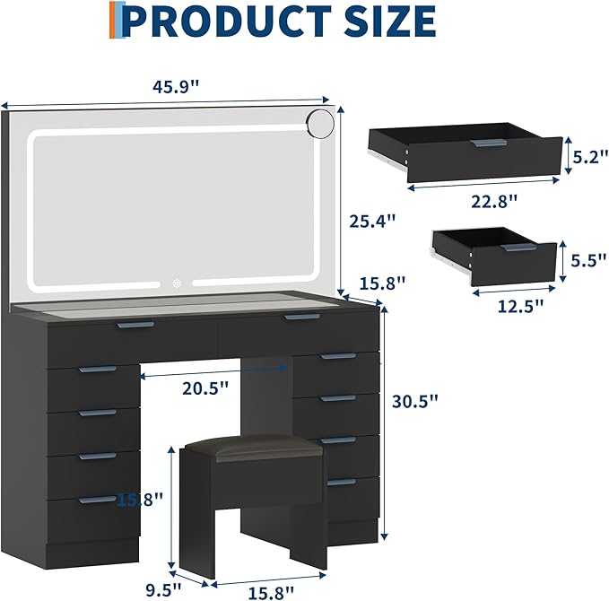 - 【 Large Storage Space 】 Product dimensions: Length 45.9" x width 15.8" x height 55.9". The makeup table with stools has a spacious makeup countertop and 10 drawers. This layout provides ample space for your favorite jewelry, hair accessories, hair care products and cosmetics, helping you keep your desk tidy.