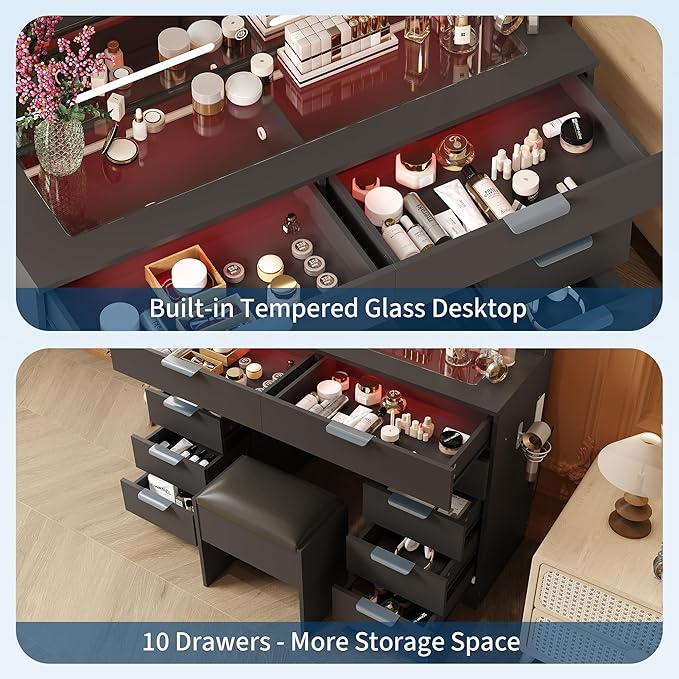Vanity Desk with Large Mirror and Lights, Makeup Vanity Desk Set with Power Outlet, Stool, 10 Drawers Storage, Magnifying Glass, Hairdryer Holder, 3 Lighting Color Adjustable for Bedroom (Black)