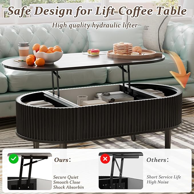 EAG Fluted Lift Top Coffee Table with Hidden Compartment, Modern Oval Coffee Table with Storage, Fully Wood Center Table for Living Room, Office, Black