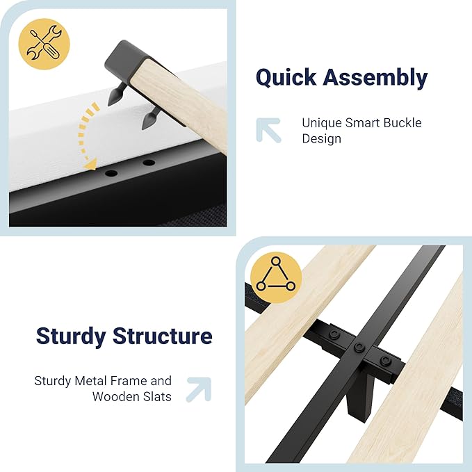 - Stable Reinforced Frame: Built with a heavy-duty metal frame and thickened wood strips, it provides stable support and extends the lifespan of the bed. No box spring is required, and the EVA silent strips eliminate friction noise from slats, ensuring a comfortable sleep