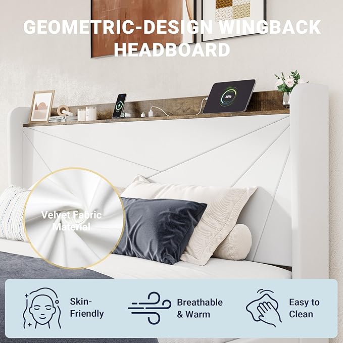 - Built-in Charging Station: The headboard features a fast-charging station with 2 AC outlets, 1 USB port, and 1 Type-C port. Multiple devices can be charged at the same time, fully meeting pre-bedtime entertainment and work charging needs