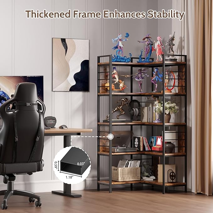 - [Corner-Friendly & Reversible Design] Designed to make the most of unused corners, this 5-tier corner bookshelf easily transforms between a vertical tower and an L-shaped layout to suit your space. Whether in the living room, study, or any tight corner, it adapts effortlessly while adding a modern industrial vibe. Stylish, space-saving, and ultra-functional—it’s a smart way to bring both form and function to your home.