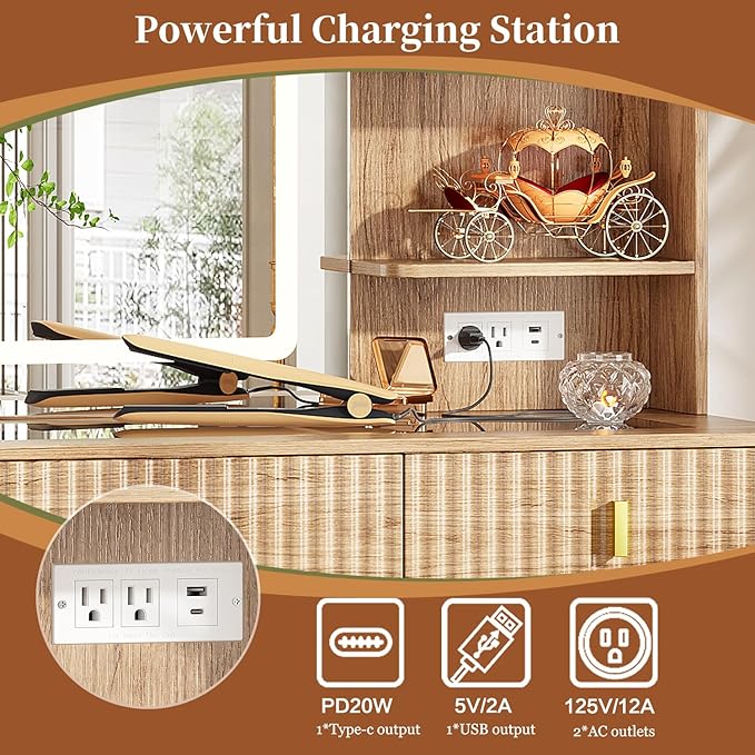 - 【Built-in Power Strip】Upgrade design!This makeup table equipped with a power strip that has 2 standard plug sockets ,1 USB ports and 1 T-C with a 4.9-foot power cord,convenient for the LED lights,hairdryer, curling iron, and charge your phone, tablet, or other electronics.