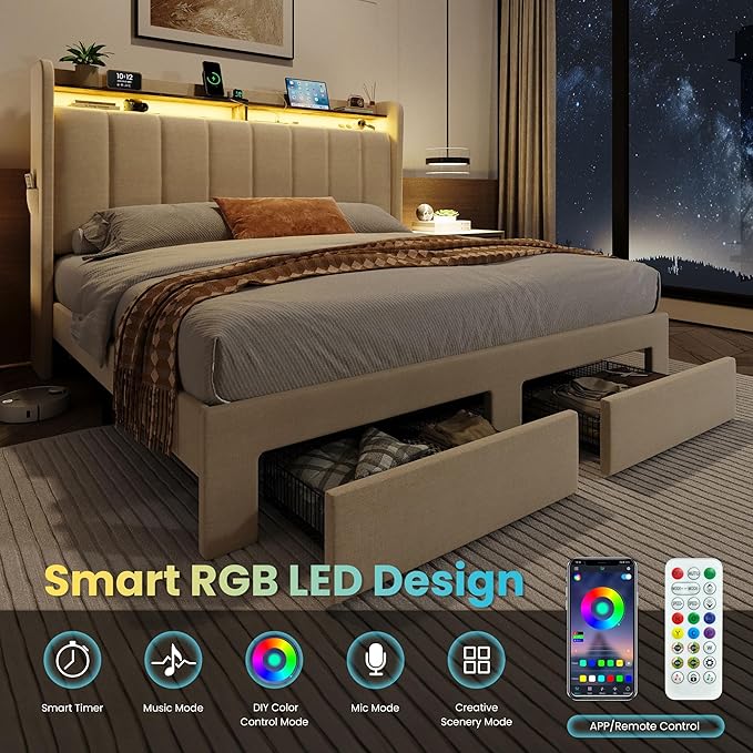 - Multicolor RGB LED Lighting: Ambient LED lighting integrated into the headboard complements the queen size bed frame. Use the included remote or the mobile app to customize color, brightness, lighting modes and timer settings to suit different styles and scenes, bringing versatile mood-enhancing illumination to your bedroom