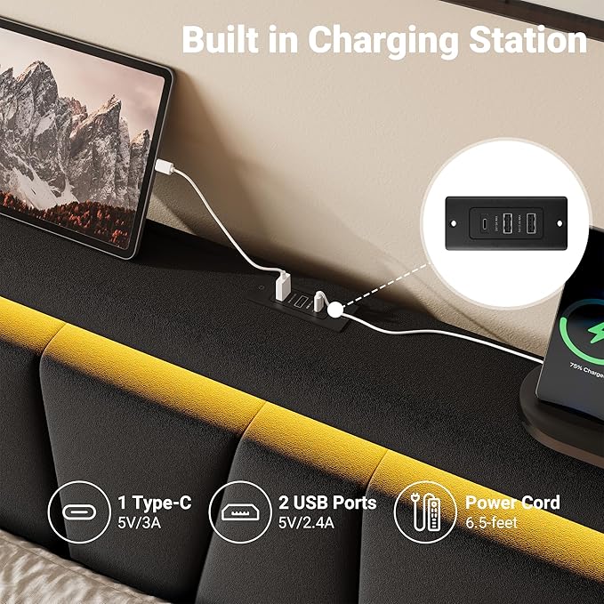 - Ultra-Convenient Charging Station: Never run out of battery again! The headboard of this LED platform bed includes 2 USB ports and 1 Type-C port. Keep your phones, iPads, and other devices powered up and within easy reach