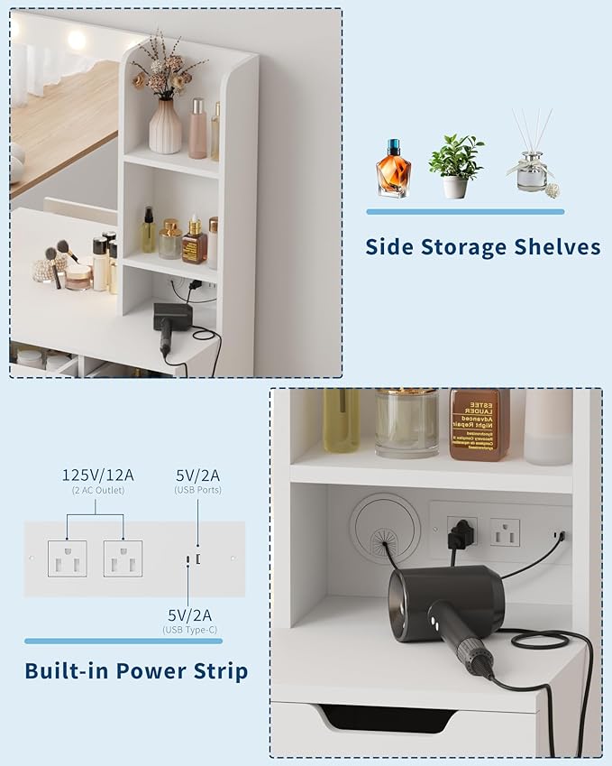 - BUILT-IN CHARGING STATION & POWER OUTLET: Keep hair tools, phones, and beauty devices charged and ready on your vanity desk with mirror and lights. Features convenient plug sockets and USB ports – eliminate messy extension cords & adapters forever!