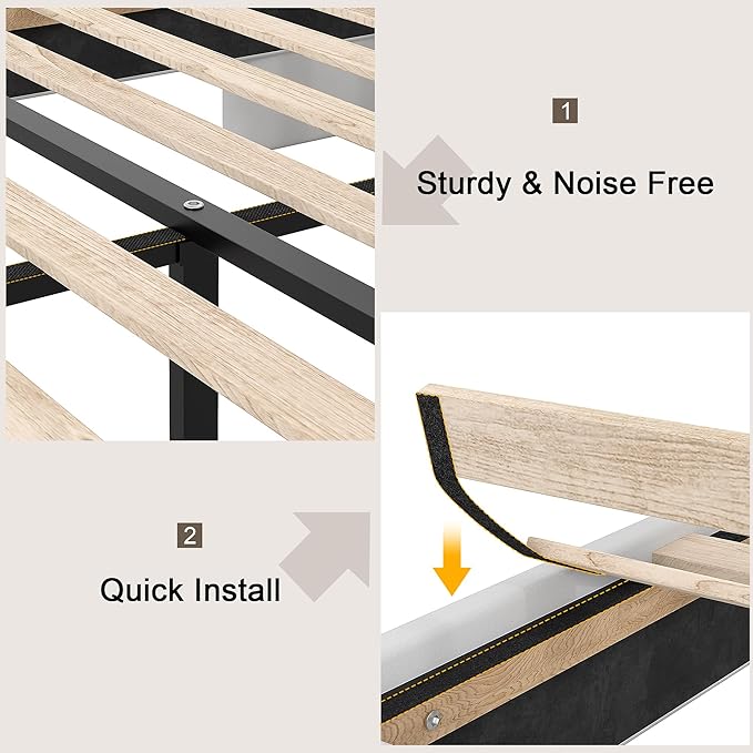 - Stable & Firm Structure - 12 wooden slats and 9 legs combo with center steel frame support, this queen size bed frame features up to 1200 lb max weight capacity. Works great with most kinds and height mattresses. No box spring needed.