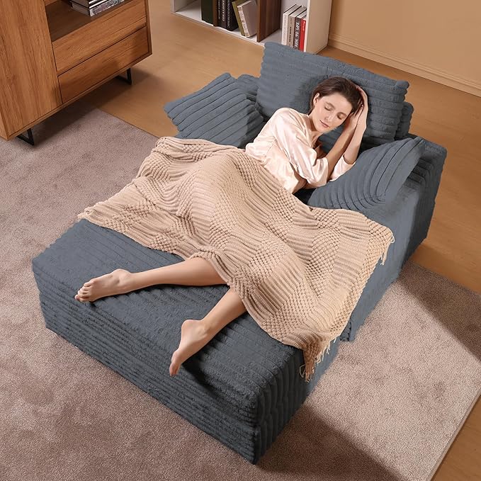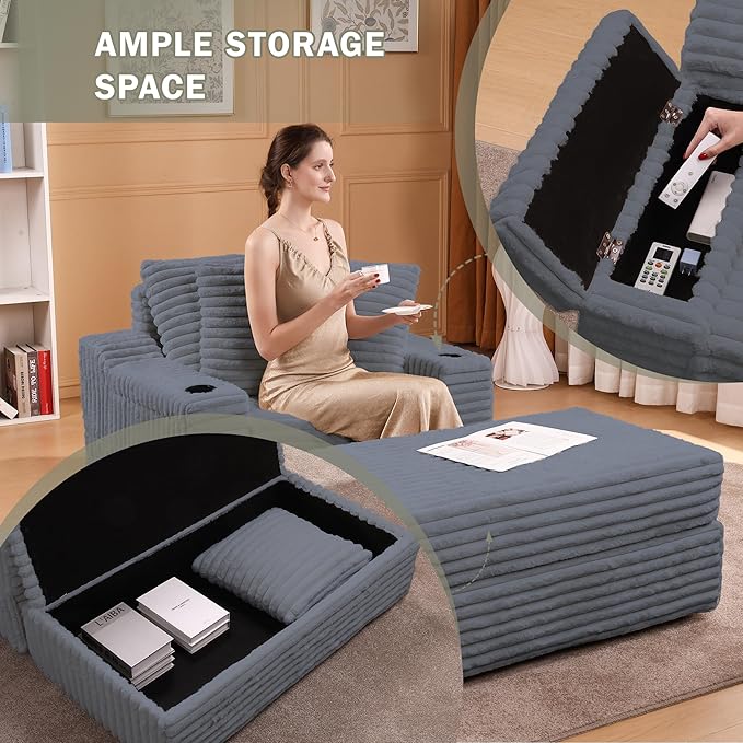Garvee Grey Oversized Chaise Lounge Chair Indoor with Storage Ottoman, Upholstered Corduroy Sofa Bed Cloud Couch with 3 Pillows, Single Sleeper Sofa Chair for Living Room, Bedroom