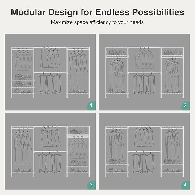 - Easy to Assemble: No complex tools or frustration needed. Our stand alone closet system comes with clear, step-by-step instructions and all parts are clearly labeled. You can easily assemble it by yourself and start organizing right away. (We recommend a detailed read of the manual before starting).