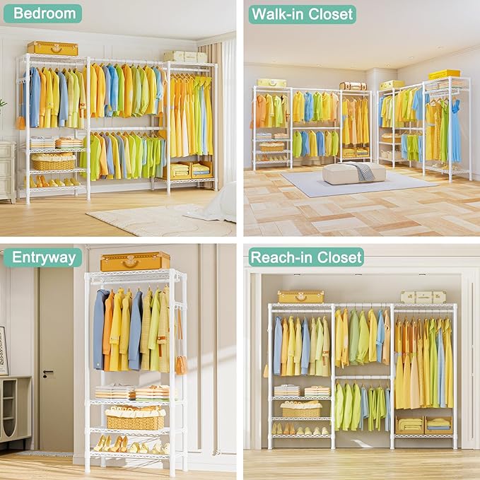 - Customizable Layout in Your Way: All 6 wire shelves and 4 hanging rods are fully adjustable in height for different types vertical space needs. Effortlessly create dedicated zones for long dresses, double-stacked shirts, shoes, bags and storage bins. E06 vertical adjustable closet system empowers you to design a storage space that perfectly matches your life.