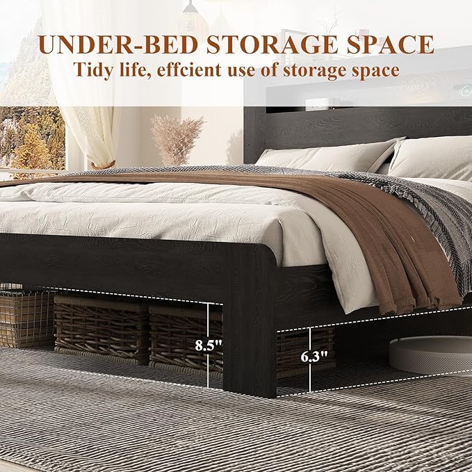 - Bookshelf Storage & Storage Space Under: The bed frame designs with Bookshelf, and Storage Headboard with Led Lights. The under-bed storage space of this rustic bed frame can improve the utilization of bedroom space, allowing you to better store items while making your bedroom look clean and tidy.